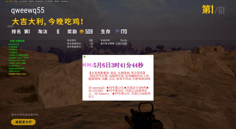 关注网盘同号.2个百鸡起步.1个300连鸡起步.稳定的雅痞 自己查下战绩就清楚了.文章源自-樱花卡盟https://www.yinghuakm.cn/樱花卡盟,绝地求生卡盟,dnf卡盟,辅助卡盟,lol辅助,cf辅助,辅助发卡平台-https://www.yinghuakm.cn/2135/.html
