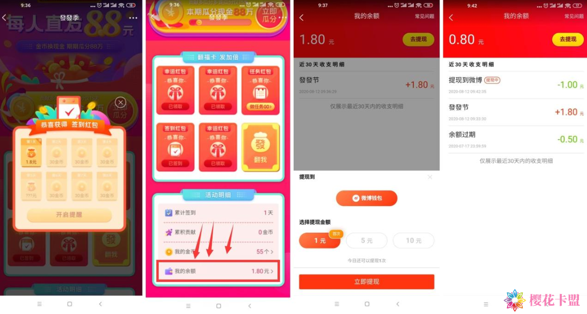 下载登录新浪新闻APP->然后打开地址跳转到新浪新闻APP参加->点开5个红包->有一个会中1.8元->下拉页面我的余额提现