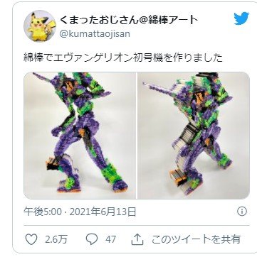 《机动战士高达》超级多的衍生作品,无论是模型还是动漫,电影都非常的多,而且还有很多玩家自己制作的手工作品百花齐放,有位高达玩家kumattaojisan专门用棉棒制作各种动漫游戏角色的高玩。近日这位玩家又晒出新作品EVA初号机引发网友热议。