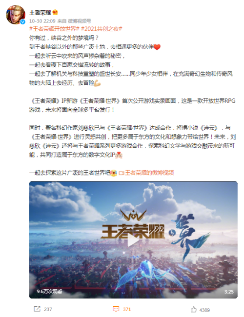 同时,著名科幻作家刘慈欣已与《王者荣耀·世界》达成合作,将携小说《诗云》,与《王者荣耀·世界》进行灵感共创,把更多属于东方的文化和想象力带给世界!未来,刘慈欣《诗云》还将与王者荣耀系列更多游戏合作,探索科幻文学与游戏交融带来的新可能,共同打造属于东方的数字文化IP