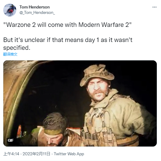 在这之后,汤姆最后发布的一条跟《战区2》发布有关的推特又说到:“不确定今天是否会得到《战区2》的消息,但可以肯定即便是真的公布消息,也只有博客文章之类的内容。”