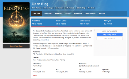 据国外统计网站HowLongToBeat调查部分玩家数据后显示,《艾尔登法环》主线剧情的平均耗时为45小时40分钟。