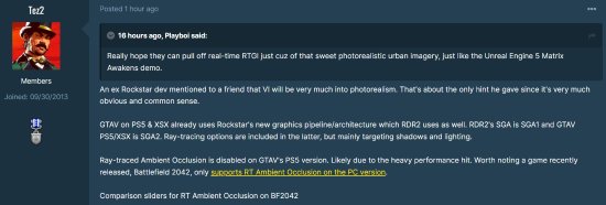 今日,据知名爆料人Tez2消息,一位前R星员工在回复网友对《GTA6》的愿景(该网友希望游戏能有光追全局光照,达到黑客帝国虚幻5演示那种画面效果)时,表示该作将非常真实,这是他唯一能给出的暗示。
