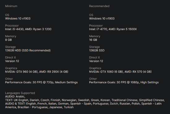 高画质 1080p/30fps需求:16GB内存、Intel i7-4770或AMD Ryzen 5 1500X处理器以及NVIDIA GTX 1060或AMD RX 570显卡,硬盘容量需求为126GB。文章源自-樱花卡盟https://www.yinghuakm.cn/樱花卡盟,绝地求生卡盟,dnf卡盟,辅助卡盟,lol辅助,cf辅助,辅助发卡平台-https://www.yinghuakm.cn/6089/.html