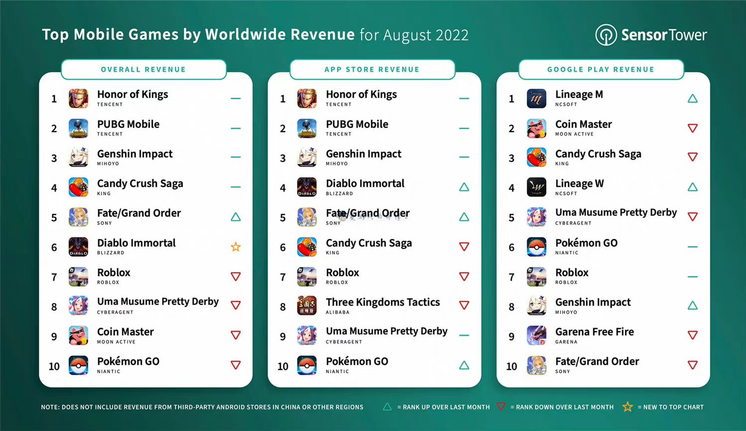 其实8月全球手游畅销榜TOP10中的产品变化不大,《原神》、《糖果传奇》、《Roblox》、《赛马娘》、《金币大师》、《宝可梦GO》都是老面孔。值得注意的是:《FGO》再进一步,从7月份的第八名爬到了8月份的第五名。这也很好理解,毕竟按照惯例,《FGO》七八九月份的游戏活动是非常猛的,历年来这段时间的收入都特别高。
